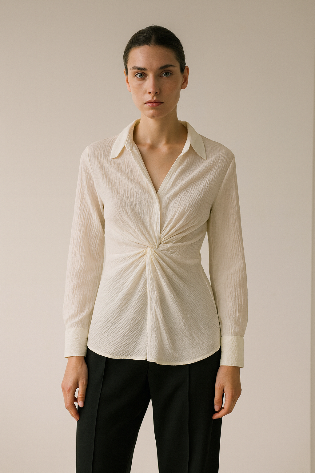 Details: Twisted knot in centre, full sleeves, collared neckline.
